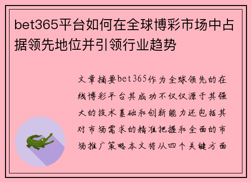 文章摘要:bet365作为全球领先的在线博彩平台,其成功不仅仅源于其强大的技术基础和创新能力,还包括其对市场需求的精准把握和全面的市场推广策略。本文将从四个关键方面详细探讨bet365如何在全球博彩市场中占据领先地位,并且如何通过其创新的模式和全球化的运营策略,成为行业的领航者。首先,bet365注重科技创新,始终保持领先的技术优势;其次,平台的用户体验和市场定位策略帮助其牢牢抓住了全球用户的需求;第三,bet365通过全球化的市场扩展与合作策略,巩固了其在全球博彩行业中的地位;最后,bet365在合规性和社会责任方面的卓越表现,为其赢得了广泛的市场认同,进一步巩固了其行业领导者的地位。通过这些方面的综合分析,本文力图呈现bet365如何通过多元化战略,引领全球博彩行业的未来趋势。