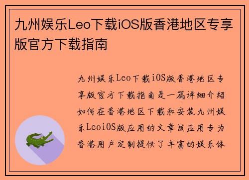 九州娱乐Leo下载iOS版香港地区专享版官方下载指南是一篇详细介绍如何在香港地区下载和安装九州娱乐Leo iOS版应用的文章。该应用专为香港用户定制,提供了丰富的娱乐体验,包括游戏、赛事和互动平台。本文将从多个角度对九州娱乐Leo下载iOS版香港地区专享版的官方下载流程进行详细分析,包括下载步骤、设备要求、安装注意事项及常见问题解决方案等。通过这篇指南,读者能够轻松了解如何顺利下载并安装该应用,享受无缝的娱乐体验。